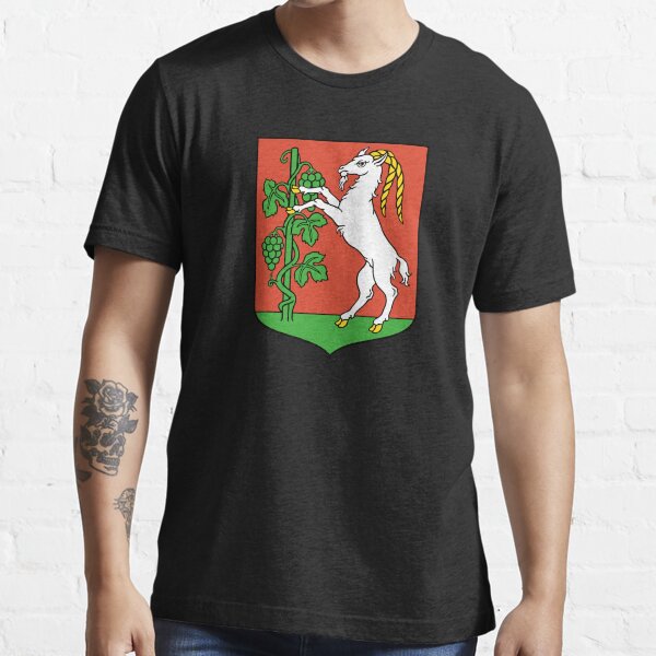 The coat of arms depicts a silver goat with golden corrugated horns and golden hooves, placed in a red field facing to the right, climbing from green grass to a green wine bush.